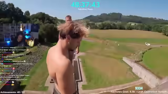 04:03:16Während des Spielens wird eine Pause eingelegt, um sich zu entspannen und abzulenken. Es wird erwähnt, dass es Micho nicht gut geht. Der Streamer zeigt sich begeistert von einer cremigen Spinat. Die Zuschauer werden eingeladen, sich während des Essens das Schlappentour-Video anzusehen. Es wird beschrieben, wie die Schlappentour funktioniert: Sie reisen mit einem Wohnmobil in ein Land und suchen nach den besten Spots für Stunts und Sprünge. Die Schlappen machen Stunts, Sprünge und Parcours. Es wird Werbung für die Schlappen-Tour-Merchandise gemacht, insbesondere für T-Shirts. Die Aktionen der Schlappen werden als Mischung aus deutschem Jackass und Stunts beschrieben. Es wird erwähnt, dass sich jemand am ersten Tag den Fuß gebrochen hat und aus der Tour ausscheiden musste. Der Damm erinnert an einen Tempel in Mexiko, Chicken Itza. Es wird überlegt, wie man Geckos anlockt. Die Sicherheitsbeauftragten tauchen das Wasser ab, um die Tiefe zu überprüfen. Es wird eine Emma-Matratzen-Werbung gezeigt, in der die Vorteile der Matratze hervorgehoben werden. Es gibt einen 10-Jahre-Geburtstag-Sale mit bis zu 50% Rabatt und die Möglichkeit, mit dem Code FREERUNDING zusätzlich 5% zu sparen. Es wird die Schwierigkeit des Aufstiegs zum Damm beschrieben. Ette wird währenddessen von einem Husky attackiert. Es wird erwähnt, dass Bries das geplante Dropswing aufbaut. Es wird die Frage aufgeworfen, was Bries vorhat, da ein Swing von dort unten in metertiefem Wasser enden würde. Es wird spekuliert, dass er sich an den Griff hängen und ins Wasser droppen will.