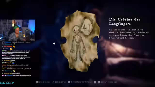 03:15:33Ein zentrales Pui-zel ist die Lösung des Feuerritus. Der Streamer muss die korrekte Abfolge der Symbole Feuer, Kopf, Waffe und Baum herausfinden, die auf einer alten Skizze dargestellt ist. Durch mehrmaliges Versuchen und die Hilfe des Chats wird die richtige Reihenfolge erkannt und die 'Rückkehr der Körper' eingeleitet. Die Erzählung über die Geschichte der Molgrims und die 'bannten Körper' wird dabei entschlüsselt.