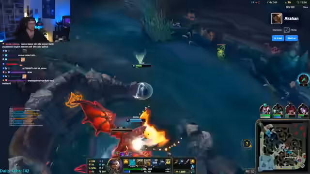 07:14:18Der Fokus wechselt auf den neuen Champion Akshan, dessen Fähigkeiten der Streamer zunächst durchsucht und erklärt. Er stellt fest, dass Akshan schwieriger als Akali ist und vor allem unsichtbar werden und verbündete Champions wiederbeleben kann. Die Gameplay-Mechaniken, wie das Seilspringen und die ultimative Fähigkeit, bereiten ihm Kopfzerbrechen und führen zu anhaltenden Toden im Spiel.