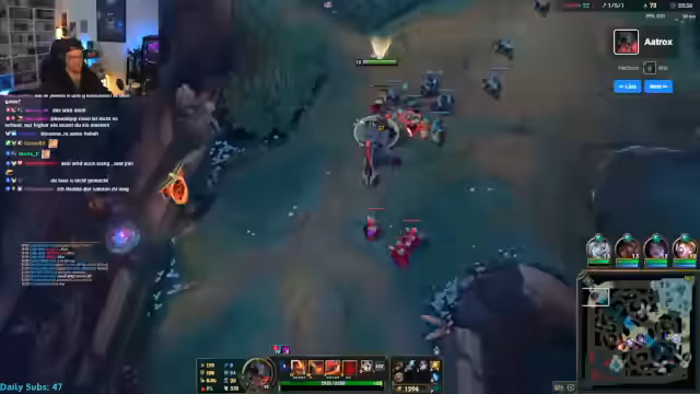 01:45:00Die ersten Spiele mit Aatrox auf der Top-Lane verlaßen äußerst frustrrierend. Der Streamer kämpft mit dem Matchup gegen Darius und Heimerdinger, die ihm das Leben schwer machen. Seine Farm ist minimal, er stirbt häufig und es kommt zu heated Momenten im Chat. Trotzdem zeigt er Engagement und versucht, die Spiele zu gewinnen, auch wenn er zugeben muss, dass Top-Lane seine schwächste Lane ist und er Aatrox nie zuvor gespielt hat.