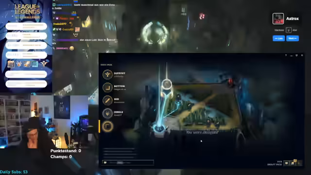 08:53:02Nach Akshan wechselt der Streamer zum Champion Alistar, der als Support agieren soll. Er ist positiv eingestellt und beschreibt Alistars Fähigkeiten als einfach und mächtig, da er Gegner gegen die Mauern smaschen und selbst Turm-Schaden tanken kann. Der Streamer versucht, sich in die neue Rolle einzuarbeiten und berichtet von unerwarteten technischen Problemen, die ein Spiel verhindern.
