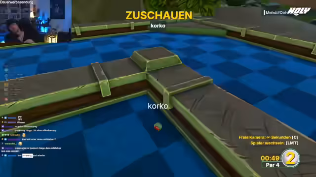 04:00:17Das Golf-Spiel entwickelt sich zu einer chaotischen Veranstaltung. Die Physik-Engine wird häufig kritisiert und die Kollisionseinstellung sorgt für zusätzlichen 'Spice' und Chaos. Spieler scheitern an komplexen Hindernissen, und das Spiel ist geprägt von lustigen Fehlschlägen und unkonventionellen Lösungsansätzen. Der Streamer verliert die Fassung mehrfach und nennt das Spiel 'deluxe Gameplay' und 'Quark'.