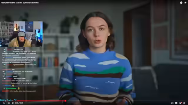 00:29:12Der Streamer thematisiert das gesellschaftliche Thema der männlichen Gewalt im Zusammenhang mit dem neuesten Brandanschlag auf eine Ehefrau. Er kritisiert die männlichen Kommentare, die sich angegriffen fühlen, wenn von 'Not all men, but always a man' die Rede ist. Er betont die statistische Realität von Femiziden und den sozialen Druck, den Männer empfinden, über Emotionen nicht zu sprechen, was zu psychischen Problemen wie Depressionen und Suiziden führt.