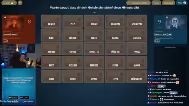 01:43:28Im weiteren Verlauf der Runde wird intensiv an der Verbindung der Wörter wie 'Luxemburg' und 'Alpen' gearbeitet. Der Streamer erinnert sein Team daran, mögliche Begriffe im Hinterkopf zu behalten. Die Gegner scheinen jedoch nicht auf die vorgegebenen Wörter zu reagieren. Es folgen Versuche, Begriffe wie 'AIDA' und 'Konto' zu verbinden, die als zu kompliziert eingestuft und verworfen werden. Nachdem ein erstes falsches Wort angeklickt wird, wächst der Druck, da die Runde zu verlaufen droht.