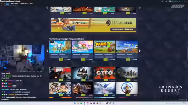 02:45:01Ein plötzlicher Sprung zum Steam-Sale leitet einen umfassenden Spiele-Check ein. Viele Titel wie Risk of Rain 2, Jedi: Survivor und Silent Hill 2 werden vorgestellt und bewertet. Der Streamer zeigt seine Kaufwünsche, wie Stellar Blade, äußert aber auch Unverständnis über die hohen Preise mancher Spiele. Danach kehrt er zu seinem Hauptspiel Pokémon-Ko zurück, wo er seine Baupläne für seine Insel detailliert vorstellt und eine Hide-and-Seek-Map mit der Community plant.