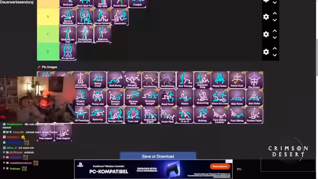 05:42:53Das Ranking wird mit anspruchsvollen und unkonventionellen Positionen wie 'Octodildo' oder 'Oral Therapie' fortgesetzt, bei denen der Streamer ofter unzufrieden ist, da er sie nicht nachvollziehen kann oder sie ihm zu absurd erscheinen. Er kritisiert auch Positionen, die er als zu anstrengend oder unkomfortabel empfindet, wie zum Beispiel 'Group Pyramid', die er als 'Human Centipede' bezeichnet und als extrem anstrengend ansieht.