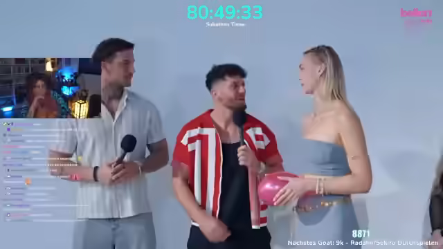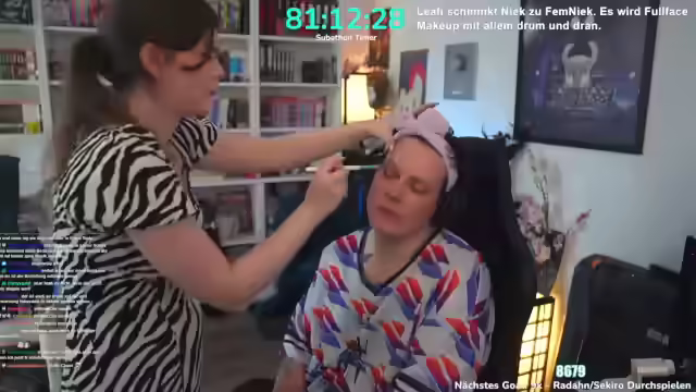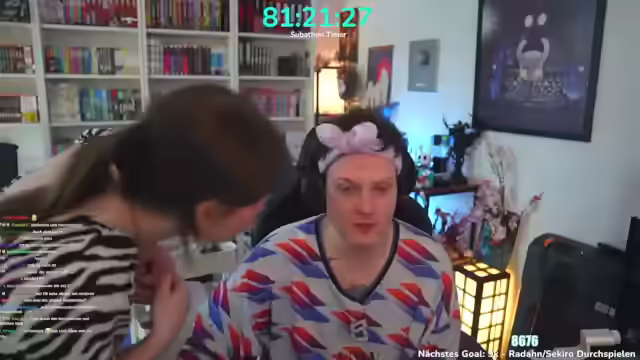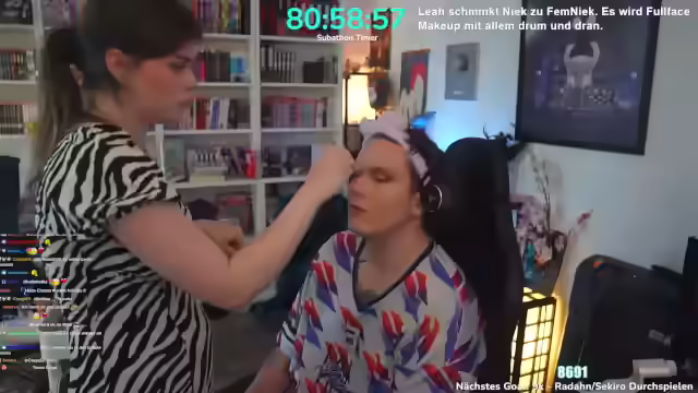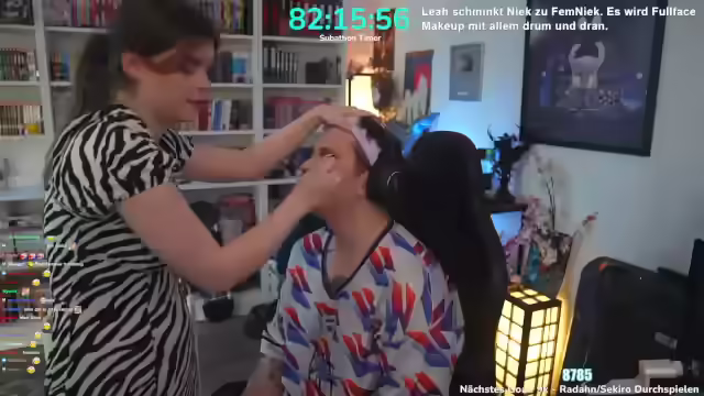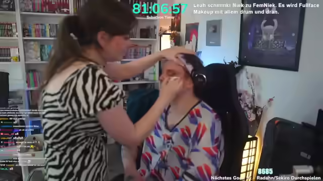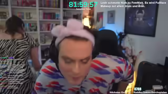 00:07:05Es wird angekündigt, dass im heutigen Stream FemNiek im Vordergrund steht, mit einem kompletten Makeover inklusive Kleid, Brüsten, Wimpern, Make-up und Perücke. Der Timer steht wieder bei über 80 Stunden, und es wurden 8656 Subs erreicht. Bei 9000 Subs wird entweder Sekiro komplett durchgespielt inklusive Endboss oder der Elden Ring DLC mit dem Endboss Radan erneut angegangen. Die Zuschauer können wählen, sobald die neue Sub-Zahl erreicht ist. Ein Update zu den erreichten Zielen wird gegeben: Beine wurden gewachst, Femnik steht an, und der K-Pop-Tanz wird in Angriff genommen. Das Twitch-Team rät von einer Domina ab, da dies zu einem Bann führen könnte. Stattdessen wird nach einer Alternative gesucht, wie z.B. ein Horrortag.
