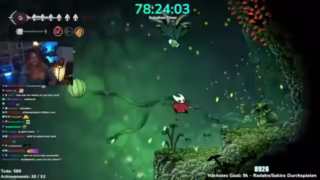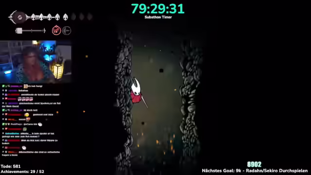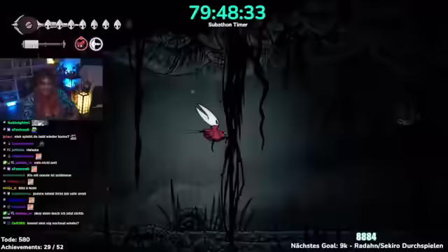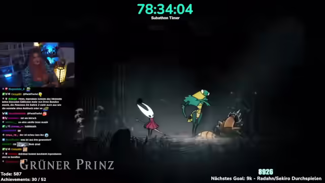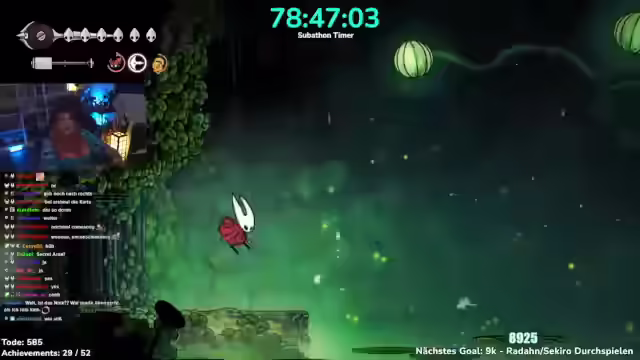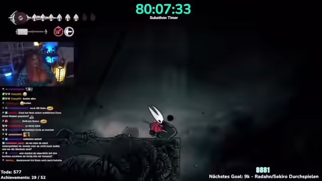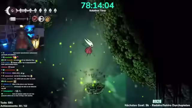 05:18:02Die Streamerin kommt um 20.30 Uhr aus der Schule und geht zum Schmied. Sie plant, die schwarzen Beben einzudämmen und die Quelle der Beben unter den Flammensee zum Versiegeln zu bringen. Sie braucht jemanden, der eine Tauchglocke hinablassen kann. Sie nimmt eine Bank mit und geht in die Glocke. Die Glocke bricht und sie sind gefickt. Sie sind im Abgrund vom Holonest. Sie tötet Gegner und nimmt eine Karte. Sie hätte sich auch noch mal über so ein kleines Comeback im Hollownest gefreut. Sie nimmt die Bank und liest einen Text vor. Sie nimmt die verborgene Kraft, die Blüte, die die Dunkelheit abwehrt. Sie sitzt sich auf die Bank. Sie versucht, alles noch zu ordnen. Sie hat keine Seide mehr. Sie findet eine Rune mit der Abbildung der Form GB, gegebener Lehre. Sie bekommt einen Eintrag. Sie will wissen, bei wie viel Prozent sie wirklich ist. Sie findet den Weitblick, ein Überwachungsinstrument. Sie wettet mit dem Chat, bei wie viel Prozent sie von 100 Prozent ist. Sie findet einen Gang und ein arcanes Ei.