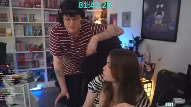 01:39:02Gegen Ende des Streams wurden verschiedene kleine Challenges im Chat vorgeschlagen, wie etwa einen K-Pop-Tanz. Parallel lief eine Feier-Musiklist, die als 'Feisty White Girl Playlist' bezeichnet wurde. Während des weiteren Verlaufs gab es immer wieder kleine Auseinandersetzungen mit Chad, dem Nebenperson, über technische oder humoristische Dinge, die die Stimmung jedoch auflockerten.