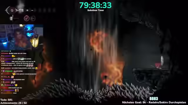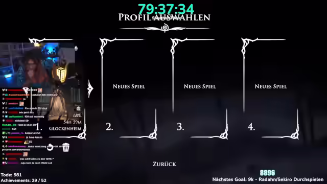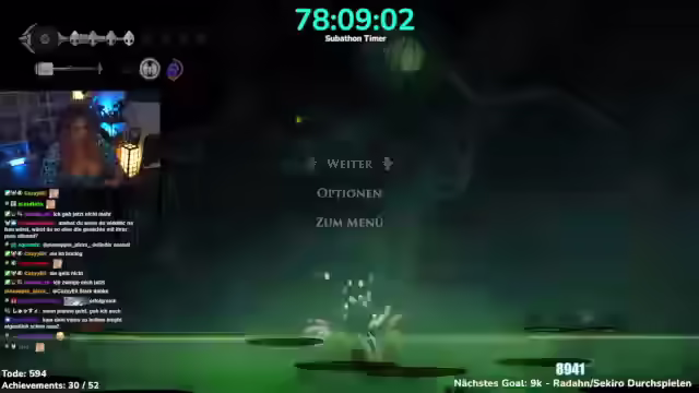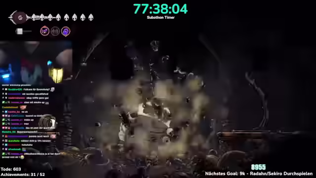 09:31:51Es wird sich gefreut, dass ein Zuschauer einen schönen Kinobesuch hatte. Es wird darum gebeten, mit dem Backseating aufzuhören und erst einmal selbst gegen den Boss kämpfen zu wollen. Es wird ein Held gerufen und ein Wunsch erfüllt. Es wird sich über den verlorenen Garmond gefreut und gesagt, dass es jetzt richtig abgeht. Es wird ein kurzer Update gegeben, wie viele Achievements noch fehlen und welche es sind. Es wird festgestellt, dass es auf der PS keine Steel Soul Trophäe gibt und dass es umso besser ist, das auf dem PC zu machen. Es wird sich bedankt und sich auf den Weg zur Sturmseite des Berges gemacht. Es wird überlegt, ob heute noch das Ende erreicht wird, aber festgestellt, dass noch zu viele Achievements fehlen. Das Ziel ist es, diese Woche noch die 100% zu erreichen. Die Session ist geprägt von einer Mischung aus Kinobesuchen, dem Kampf gegen Backseating und der Jagd nach Achievements.