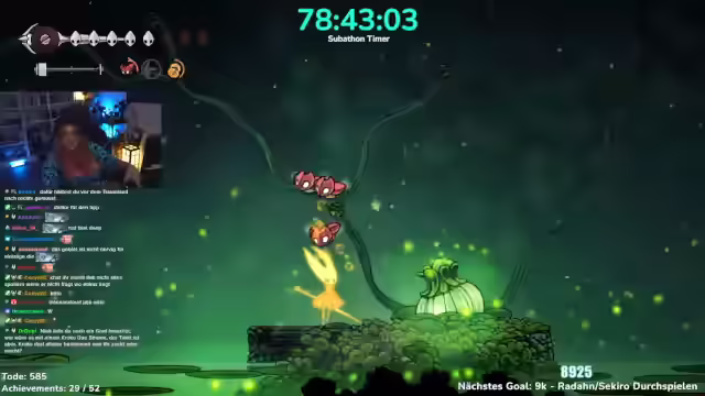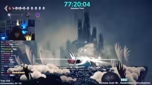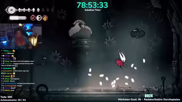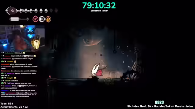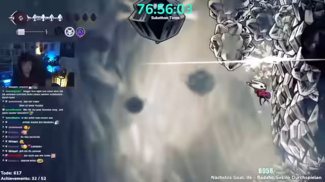 06:10:08Es wird über das Gameplay gesprochen, inklusive der Frage, ob ein Diva rülpsen darf. Ein Poll zur Abstimmung zwischen Radon und Sekiro wird hinzugefügt. Es wird festgestellt, dass man gefühlt keine Perlen hat und etwas verkaufen muss. Die Streamerin probiert die kleinen Butchies aus und kommentiert, dass Wasser nass ist. Team Cherry hat bestätigt, dass es offiziell streicheln bedeutet, wenn man die haut. Es wird festgestellt, dass man im Spiel nach 70 Stunden erst 68% erreicht hat und überlegt, was noch fehlt. Es werden fehlende Maskenteile und andere Dinge identifiziert, die Prozente geben würden. Die Streamerin geht in den Moschelwald und braucht Gegner, die Geo geben. Es wird überlegt, Story zu machen und in die Moosgrotte zu gehen.