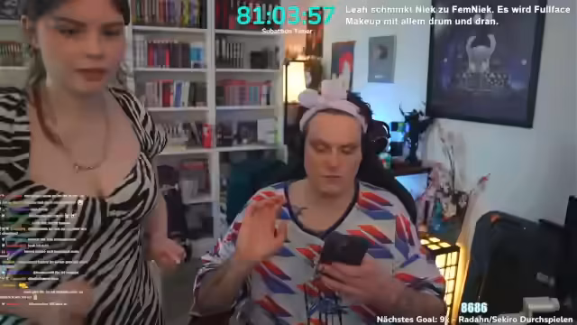 03:04:44Eine zentrale Aktivität im Stream sind Telefonate mit Freunden und Influencern wie Kroko, Firestar und Philo. Die Anrufer werden von der femininen Erscheinung überrascht und spielen mit der Rolle. Der Streamer ruft auch seine Mutter an, die die Verwandlung als süß bezeichnet. Zwischen den Anrufen interagiert er intensiv mit dem Chat, beantwortet Fragen und diskutiert das aufwendige Make-up, das etwa 1,5 Stunden in Anspruch genommen hat.