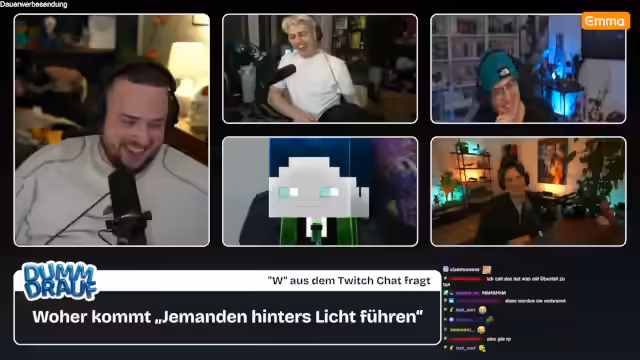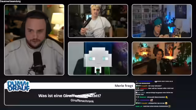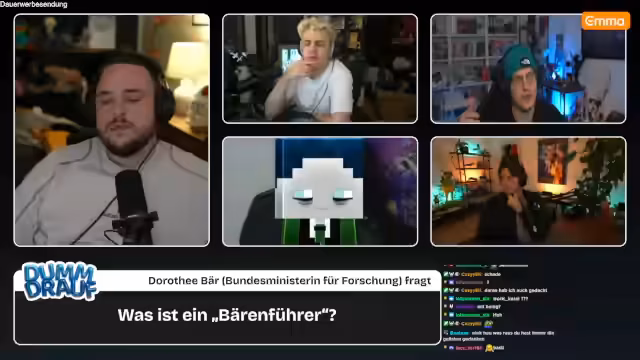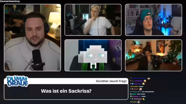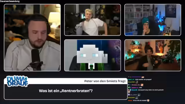 01:25:25Die dritte Folge des Formats "Dumm drauf" beginnt mit der Begrüßung der Zuschauer und der Vorstellung der Gäste Kevin, Niek und Basti, sowie des "Joker-Kandidaten" Herr Bergmann. Das Spielprinzip wird erläutert: Die Teilnehmer müssen Begriffe erraten, die aus der Community stammen und oft um die Ecke gedacht werden müssen. Die Fragen sind herausfordernd und versprechen eine spannende Sendung, für die sich Kenny bei der Vorbereitung besonders ins Zeug gelegt hat. Die erste Frage wird direkt gestellt, um die Runde einzuleiten.