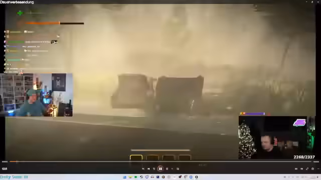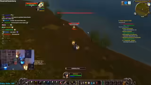 14:17:29Nach dem Tod des Charakters 'Peach' entsteht ein logistisches Problem, da sich der Spieler und der Streamer an verschiedenen Orten befinden. Ein spontaner Hilfsaufruf im Chat führt dazu, dass ein Zuschauer sich bereiterklärt, den Spieler zu transportieren. Gemeinsam wird ein Plan gefasst, um die Verbindung wiederherzustellen und die gemeinsame Fortsetzung des Spielens zu ermöglichen. Währenddessen versucht der Streamer, das Spiel vorzubereiten, indem er questet, bleibt aber angespannt und wachsam für weitere Vorfälle im Chat und im Spiel.