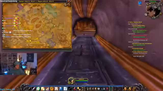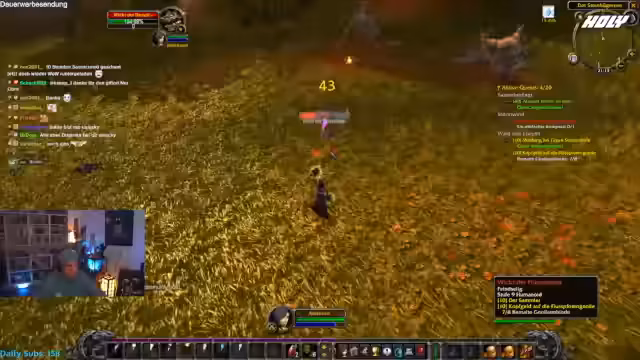 11:39:18Der Streamer nimmt mehrere Quests in der Umgebung an, um ohne Unterbrechung essen zu können. Er kommentiert seinen Spielstil und interagiert mit anderen Spielern wie Max, der ihm folgt. Es gibt eine klare Beschreibung der Questziele, darunter das Sammeln von Goldstaub und großen Kerzen. Er erwähnt auch seinen inventarbedingten Ärger und dass er für die Annahme von Quests warten muss.