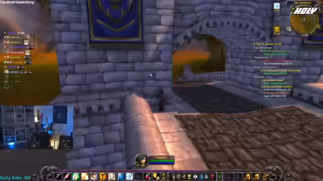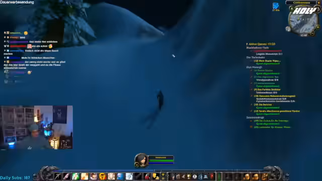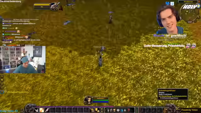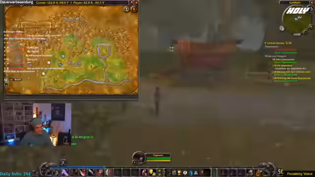 14:35:55Ein schwerwiegender technischer Fehler tritt auf: Der Streamer wird von anderen Spielern im Spiel zwar gehört, kann aber nicht interagieren oder agieren. Dies führt dazu, dass er sich vom Spiel abmelden und neu anmelden muss. Gleichzeitig wird ein Rollenspiel (RP) in der Stadt 'Goldhain' angekündigt, an dem der Streamer teilnehmen möchte, sobald die technischen Probleme behoben sind. Die Verwirrung über die Rollen und die Ingame-Kommunikation ist groß. Die Gildendynamik zeigt sich auch im Chat, wo über die wirtschaftliche Ausstattung der Gilde diskutiert wird.