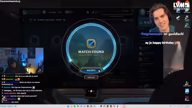 01:18:35Für seinen Geburtstag wünscht sich der Streamer einen Sieg in League of Legends. Er erwähnt, dass er seit 17 Monaten ununterbrochen spielt und nie einen Tag pausiert. Trotz eines fragwürdigen Midlane-Spiels und einer schlechten Support-Lane ist er zuversichtlich, seinen Partnerstatus in dem Spiel bald zu erreichen und einen Win zu holen.