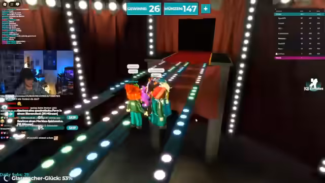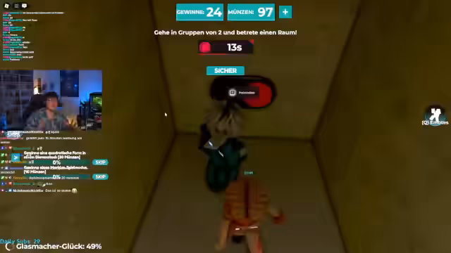 00:13:47Nach einer kurzen Session in Fish Frenzy wechselt der Streamer zu einem Squid Game Roblox-Spiel. Er erklärt, dass es sich um ein ultimatives Squid Game handelt, das auch Spiele aus Staffel 3 enthält. Der Streamer muss sich in einem 'Verstecken'-Spiel verstecken, während ein Mörder nach ihm sucht. Zusammen mit dem Chat-Teilnehmer Jona bildet er ein Team. Sie schaffen es, sich erfolgreich zu verstecken und als letzte Spieler im Spiel zu überleben und das Versteckspiel zu gewinnen.
