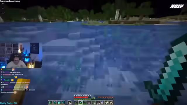 02:33:13Der Streamer sucht aktiv nach einem Trident und optimiert seine Ausrüstung. Er diskutiert mögliche Fundorte wie Ozeane, Schatzkarten und Unterwasservillages. Dabei geht es um Strategien, um Mending und Unbreaking auf dem Trident anzuwenden. Es werden auch Überlegungen zu Schätzen und deren Nutzen angestellt. Parallel dazu werden Kämpfe mit Unterwasser-Zombies und Fischen geführt, die als schwierig und damage-heavy eingestuft werden.