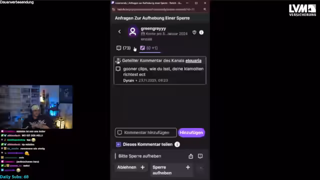 04:05:04Zuschauer der Entbahnungsanträge beginnen, als der Gast Nick, auch bekannt als Nick Beetz, dem Stream beitritt. Der Sprecher stellt ihn als 'Special Gast' vor, der als Richter für die Entbahnungsanträge fungiert. Sie durchgehen verschiedene Anträge von Zuschauern, die aufgrund von Bans früher nicht zugreifen konnten. Nick übernimmt eine harte Rolle und bewertet jeden Antrag, während der Sprecher die Hintergründe der Bannungen erklärt, die oft auf problematische Chats oder sexually suggestive Kommentare zurückgehen. Dieser Abschnitt zeigt eine Kooperation, bei der der Gast Einfluss auf die Community-Management-Entscheidungen des Streams nimmt.