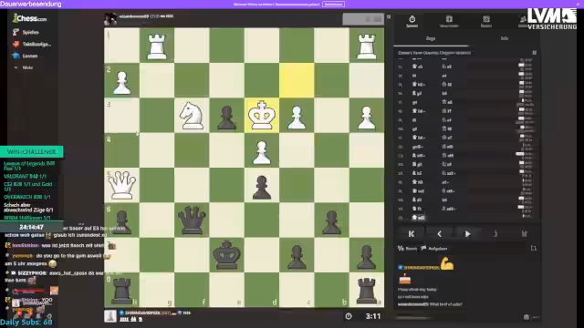 11:40:27Der Stream startet mit der intensiven Vorbereitung auf die MÄNNERCHALLENGE. Die Teilnehmer Sascha, Paul, Danny, Philipp und Niek tauschen sich über ihre nächsten Züge aus. Das Team ist optimistisch und plant, mit Bauer und Pferd einen Vorteil zu erzielen. Die Stimmung ist angespannt, aber die Jungs sind fokussiert und geben sich gegenseitig Ratschläge, um den Gegner unter Druck zu setzen und in dieser Anfangsphase eine gute Position auf dem Brett zu etablieren.