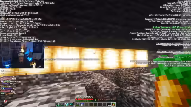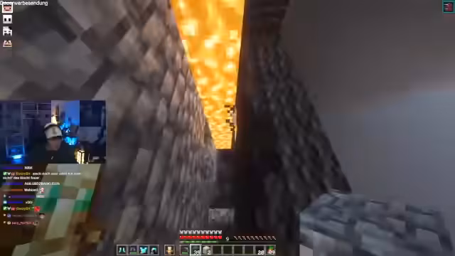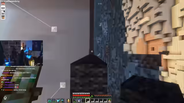 00:46:30Beim Bau der Wollewände wird eine wichtige Sicherheitsmaßnahme besprochen: Wolle kann sich durch eine Schicht Stein hindurch an Lava entzünden. Daher müssen die Bauenden ständig darauf achten, ob sich Lava hinter der Wand befindet. Um dies zu visualisieren, wird empfohlen, die Option für Umgebungsgeräusche im Spiel einzustellen, sodass das Brodeln von Lava als Untertitel angezeigt wird. Es wird auch diskutiert, ob die Wände direkt auf Froglight-Höhe oder eine Ebene darüber beginnen sollen, um schwarze Wolle zu sparen. Die Entscheidung fällt auf eine Ebene darüber, da der Spalt oben geschlossen wird und das Froglight nicht sichtbar sein wird. Der Streamer weist darauf hin, dass die Zuschauer sofort Bescheid geben sollen, wenn sie Lava brodeln hören, um potenzielle Brände zu verhindern.