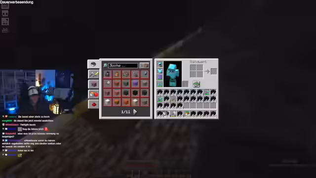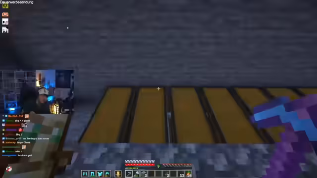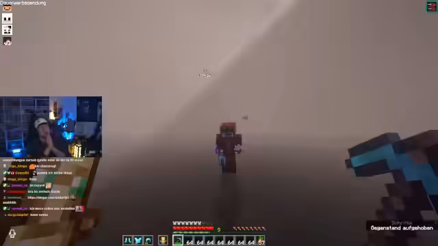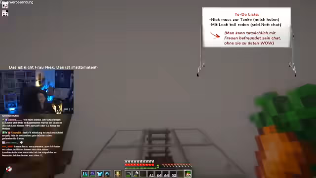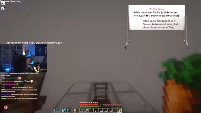 01:01:52Es wird eine Methode zur Effizienzsteigerung beim Bau der Wände diskutiert: Man stellt sich auf die Blöcke und platziert drei Blöcke nach unten, was schneller ist als einzelne Blöcke zu setzen. Diese Technik wird durch die Verzauberung "Swift Sneak" (Huschen) noch weiter beschleunigt. Der Streamer fragt in der Gruppe nach einem "Huschen 1 Buch", da er seine eigene Hose mit dieser Verzauberung verloren hat. Es wird humorvoll getestet, ob er oder ein anderer Spieler beliebter ist, indem sie unabhängig voneinander nach dem Buch fragen. Die Suche nach dem Buch ist entscheidend, um die Baugeschwindigkeit zu maximieren und die riesigen Mengen an benötigter Wolle effizient zu verarbeiten.