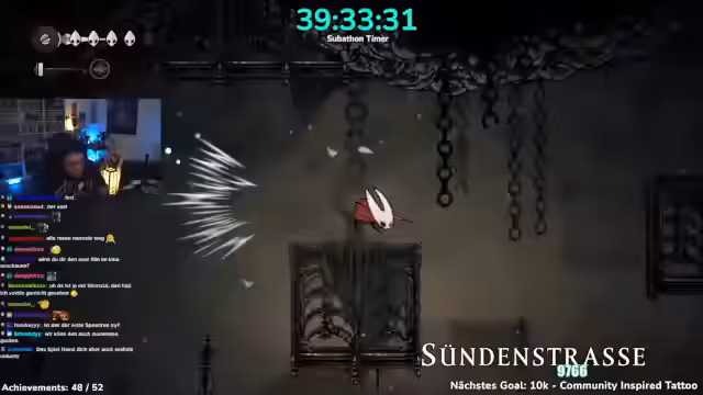 04:27:45Der Speedrun durch Hollow Knight gestaltet sich schwieriger als erwartet. Der Streamer verliert sich im Spiel, muss Routen neu erkunden und stellt fest, dass er ohne Upgrades deutlich mehr Schaden nimmt. Die Prozente im Spiel führen zu einer anderen, schwierigeren Erfahrung. Der Streamer ist frustriert von manchen Gegnern und Spielbereichen, die er als unangenehm und unfair empfindet, und kämpft mit der Orientierung.