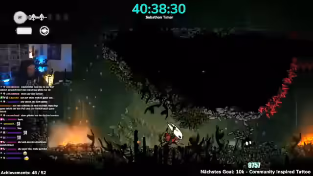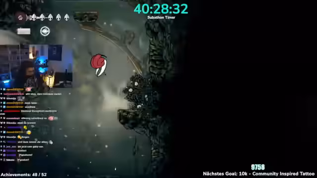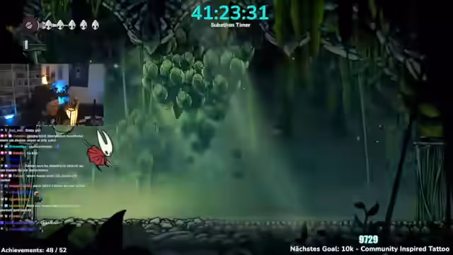 04:13:24Nachdem die Subathon-Ziele erreicht sind, konzentriert sich der Streamer voll auf das Spiel Hollow Knight. Der Fokus liegt auf einem Speedrun, um ein spezifisches Achievement zu erreichen. Der Streamer stellt sich dabei eine besondere Herausforderung: Er muss den Boss in einem Versuch besiegen, um sich der Community würdig zu zeigen. Der Versuch ist für ihn sowohl eine persönliche als auch eine für die Community wichtige Mission.