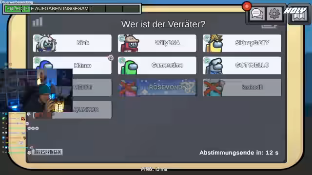 02:12:05Die Among Us-Runden werden mit einem kleinen Ratespiel fortgesetzt, bei dem die Spieler versuchen, die Identität einer Person anhand von Hinweisen wie Brille oder Zugehörigkeit zu Spandauer Gruppen zu erraten. Es kommt zu humorvollen Verwechslungen und Diskussionen über persönliche Merkmale. Der Streamer bittet Eli, in Runden, in denen er den Chat nicht sehen kann, die Immunolialen zu aktivieren, um die Kommunikation zu vereinfachen. Die Spieler stellen sich gegenseitig Fragen, um mögliche Imposter zu entlarven. Die Runde endet mit weiteren Verdächtigungen und dem Versuch, die Identität des Imposters zu lüften. Die Atmosphäre bleibt locker und humorvoll, trotz der Spannung des Spiels.