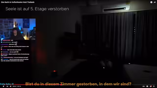 03:15:04Im Bayoku Sky Hotel wird die Geschichte erzählt, wie drei Arbeiter 130 Meter in den Tod stürzten. Das Hotel gilt als das heimgesuchteste Asiens, besonders die Etagen 62 und die Zimmer 6202-6204. Die Hotelleitung hat mit den Seelen einen Pakt geschlossen und platzierte religiöse Bücher als Schutz vor besonders bösen Geistern im schlimmsten Zimmer, 6203. Der Streamer bucht genau dieses Zimmer und bricht mehrere thailändische Aberglauben, um die Geister anzulocken, darunter das dreimalige Klopfen an der Tür und das Herauslegen der Schriften.