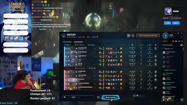 01:36:26Ein Spiel endet mit katastrophalen persönlichen Statistiken von 0-6-0 für Aphelios, was zu massiven Frust und Selbstzweifeln führt. Der Streamer diskutiert die Ursachen für das Scheitern und kritisiert stark den Spielstil eines Mitspielers, speziell einen Top-Laner, der mit einem Singed, den er als hässlich und schlecht gespielt beschreibt, in der Lane gefeedet hat. Die Niederlage führt zu Tilt-Gefühlen und zu der Überlegung, den gesamten Rank-Account zu zerstören, was die psychische Belastung der Challenge verdeutlicht.