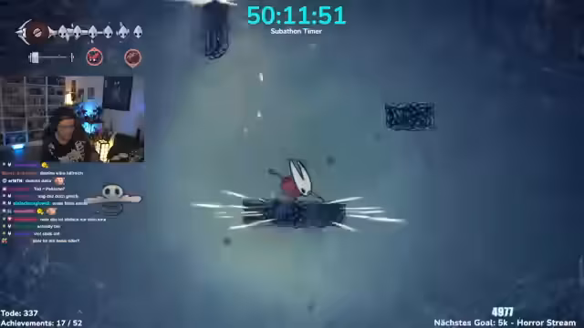 07:45:03Der Streamer weiß nicht, wie viele Parts auf YouTube kommen werden, da er das Spiel noch nicht durchgespielt hat. Er bestätigt, dass morgen Horror-Tag ist, aber dass es auch eine andere Aktivität gibt, die er machen muss: eine Podcast-Aufnahme mit Loko Elefante. Kim sagt, dass sie gehen muss, um sich nicht spoilern zu lassen. Der Streamer erklärt Kim den Weg im Spiel. Der Streamer findet das Fast Travel in dem Spiel etwas kompliziert. Er kann die Tode nicht einblenden. Der Streamer stellt fest, dass er heute schlecht im Spiel ist und nicht versteht, was es gebracht hat, das Wasser anzustellen. Er fragt den Chat, wo er duschen kann. Der Streamer findet eine Quelle, die ihn an Hollow Knight erinnert. Er stellt fest, dass es ein Shortcut zwischen zwei Punkten ist. Der Streamer bedankt sich für den Support. Er will gucken, wo ihn der Weg hinführt und ob er weiterkommt. Er stellt fest, dass er spürbar mehr Schaden bei den normalen Gegnern macht. Der Streamer will gucken, ob er links hochkommt, da es zwei Punkte zum Nachoben gehen gibt. Er bedankt sich für den Support. Der Streamer kommentiert das Schlachtfeld und will gucken, ob er von oben etwas 'unbraken' muss, um einen Shortcut zu haben. Er bedankt sich für den Prime. Der Streamer trifft auf Grindel und fragt ihn, was er in seiner Ecke sucht. Grindel bietet ihm ein Diebeswerkzeug an. Der Streamer hat zu wenig Geld dafür. Er glaubt, dass es trotzdem nicht lang geht.