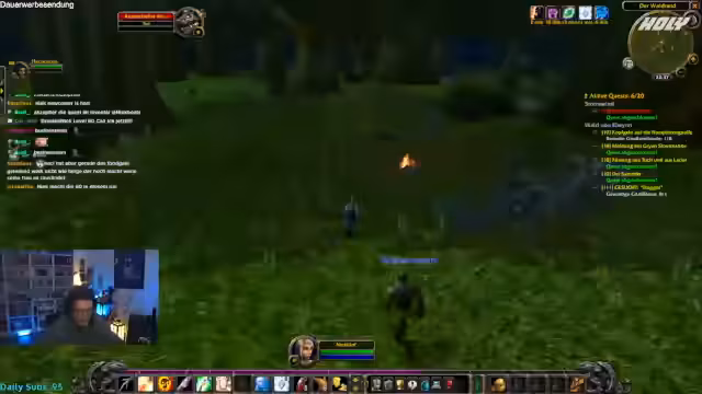 05:43:18Die Gruppe befasst sich intensiv mit dem World-of-Warcraft-Gameplay. Sie erwähnen den wichtigen Sturmwind-Buff, der kritische Trefferchancen und Angriffskraft erhöht und zwei Stunden hält. Es werden aktuelle Quests in Gebieten wie Westfall und Loch Modan bearbeitet und Schwierigkeiten, wie zum Beispiel das gefährliche Pullen von Monstern, diskutiert. Der Levelunterschied zwischen den Spielern führt zu Herausforderungen bei der Quest-Teilung.