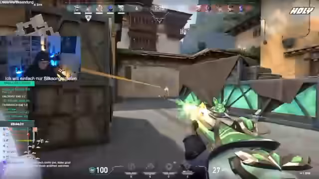 04:11:01Nach anfänglichem Unverständnis gelingt es dem Team, eine Runde zu gewinnen, was der Streamer lobt. Es folgt eine neue Runde, in der das Team koordiniert in Richtung B angreift. Der Streamer nutzt Smokes und Dash, um den Gegner zu täuschen und Positionen auszunutzen. Trotz guter taktischer Anweisungen und Versuchen, den Gegner unter Druck zu setzen, verliert das Team die Runde knapp, was zu erneuter Frustration führt.
