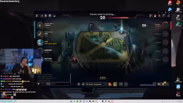 02:07:42Der Streamer wechselt zum Gaming und spielt League of Legends. Sein aktuelles Ziel ist es, aus Silber 3 aufzusteigen, um schließlich die Gold-Rankingstufe zu erreichen, was im Stream-Titel thematisiert wird. Er kommentiert sein Spielgeschehen, kritisiert Entscheidungen seines Teams und ist frustriert über mangelndes Können und strategisches Verständnis der Mitspieler, unabhängig vom Rang. Seine Stimmung schwankt zwischen Frust über verlorene Runden und Entschlossenheit, das Ziel zu erreichen.