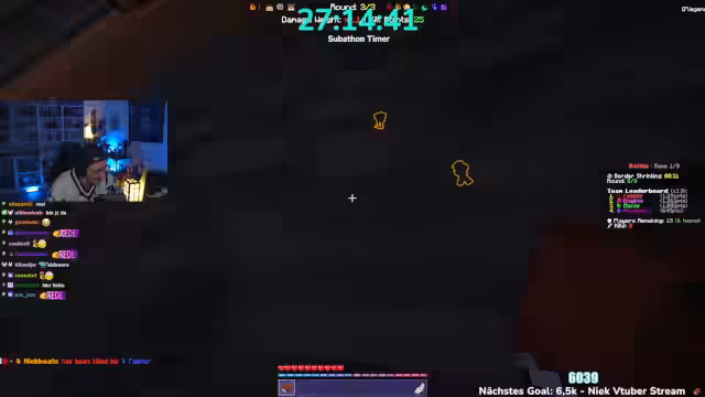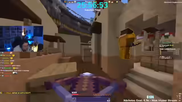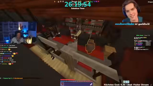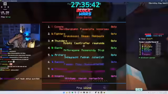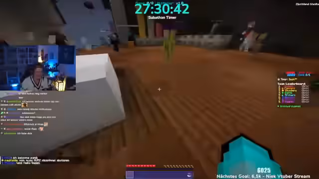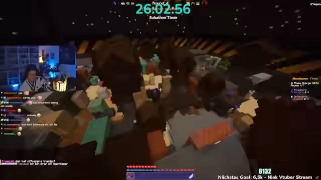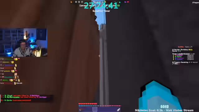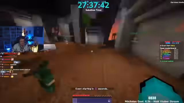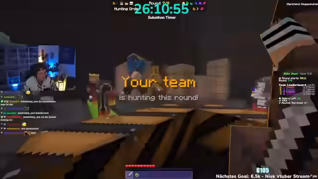 06:00:26Es wird angekündigt, dass man heute 5.000 Euro im Minecraft-Event gewinnen wird. Krokoboss kommt zu spät und wird dafür kritisiert. Die Teams werden vorgestellt: Herr Bergmann, Papaplatte, Noreax (Team Komets), Rotpilz, Carscrafter, Revinzeit, Thunders, Morge, Rosemondi, Stegi (The Giants), Smiley, Felica, Julian (The Archers), Feister, Philo, Sturmbass. Es wird diskutiert, ob der YouTube-Kanal Korken-Bit gezeigt werden soll, aber der Streamer lehnt ab. Es muss schnell ein Spiel ausgewählt werden, da die Crunch-Time beginnt. Die Entscheidung fällt auf das Spiel Battle, obwohl man im PvP nicht besonders gut ist. Es wird gehofft, dass das Spiel am Anfang gespielt wird, da es am wenigsten Punkte gibt. Die Teammitglieder begeben sich auf die grüne Fläche, um das Spiel zu starten.