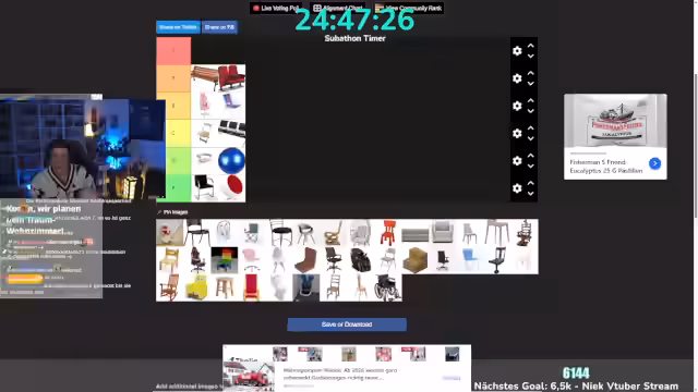 10:50:03Es wird über einen Stuhl gesprochen, der oft vom Moderator genutzt wurde, ein schwarz-roter DX Racer, der als Fundament der Streaming-Karriere bezeichnet wird. Ein 3D-Stuhl, der nicht existiert, wird als LGBTQ-Stuhl bezeichnet und diskutiert, ob er als echter Stuhl zählt. Es wird betont, dass die Bewertung unabhängig von den Farben erfolgen soll. Ein Stuhl, den Mütter als Schreibtischstuhl benutzen, wird als nüchtern und unauffällig beschrieben. Ein Stuhl, der wie ein Bidet aussieht, wird ebenfalls bewertet. Die Flughafenstühle werden erneut erwähnt, und wie unangenehm es ist, auf ihnen zu sitzen. Ein Lego-Stuhl wird als potenziell schlechtester Stuhl der Welt bezeichnet. Es folgt eine Diskussion über ergonomische Parkbänke. Ein Massagesessel wird als potenziell "abfeuernd" eingestuft. Es wird über Stühle gesprochen, die man kaputt machen, werfen oder draufsetzen kann. Ein Rollstuhl wird diskutiert, wobei die Frage aufkommt, ob man damit "abfeuern" kann, und ob er besser als andere Stühle ist. Die Liste wird als sehr geiles Ranking bezeichnet. Es wird entschieden, eine weitere Liste zu erstellen, diesmal zum Thema Insekten.