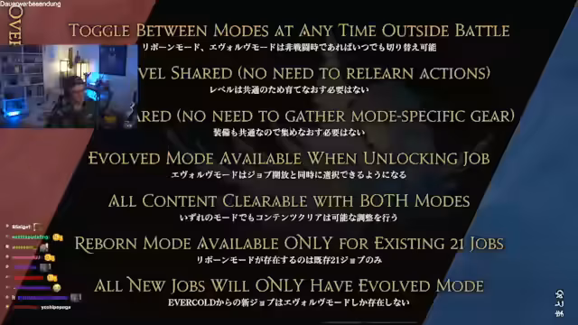 03:13:51Der Streamer erläutert das neue Job-Action-System mit zwei Modi: Reborn Mode und Evolved Mode. Diese Modi bieten unterschiedliche Aktionsrotationen für alle 21 Jobs. Es wird angekündigt, dass Evolved Mode im Allgemeinen etwas stärker sein könnte. Außerdem wird der neue limitierte Job Beastmaster vorgestellt, der auf Beutejagd und Kreaturenbändnis konzentriert ist.