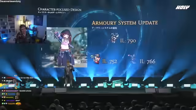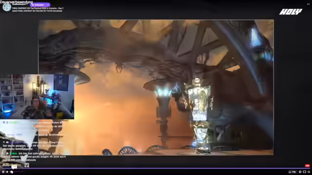 01:42:23Der Streamer kündigt ein besonderes Event an - das erste von drei großen Final Fantasy XIV Fan Festivals, das gerade live stattfindet. Er beschreibt, mit welcher Begeisterung er selbst das Spiel spielt und dass er innerhalb kürzester Zeit 24 Stunden Spielzeit erreicht hat. Dabei erläutert er den reichen Inhalt des Festivals: Willkommenszeremonie, Roulette-Game-Show, Development-Panel, Glamour-Live-Cosplay-Walk und ein Pianokonzert. Besonders freut er sich auf das angekündigte neue Addon 'Evercold', das im nächsten Jahr erscheinen wird, und dass er bei den beiden folgenden Festivals in Berlin und Tokio persönlich dabei sein wird.