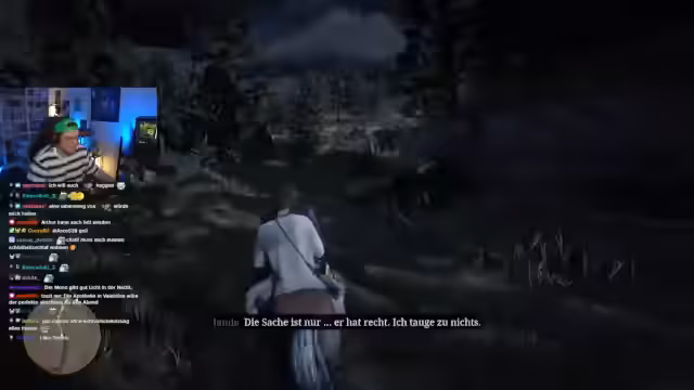 04:37:44Ein bedeutender Moment ist ein ruppiger Überfall auf eine Kutsche, bei dem der Streamer eine gefesselte Frau rettet, aber später von den Konsequenzen überrollt wird. Er erhält Kopfgeld und muss fliehen, zeigt aber auch Mitgefühl, indem er eine verzweiflte Frau an einem Wegesrand zurücklässt. Diese moralischen Ambivalenzen und die Realität des rauen Wilden Westens werden intensiv diskutiert.