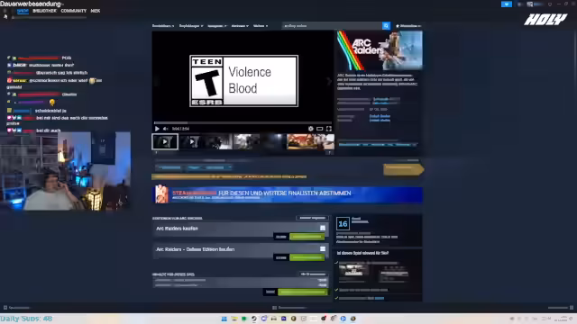 01:59:15Der Streamer durchsucht den Steam Winter Sale und kommentiert verschiedene Spiele. Er diskutiert Angebote wie 'The Witcher' für 2,99€, 'Hollow Knight' für 7€ und Rabatte auf 'Fatal Fury', 'Divinity: Original Sin 2' und 'Dead Space'. Nach intensiver Debatte mit dem Chat kauft er schließlich sechs Spiele, darunter 'Dispatch', 'Fatal Fury' und 'Heroines Through My Lens', trotz technischer Schwierigkeiten beim Kaufvorgang.