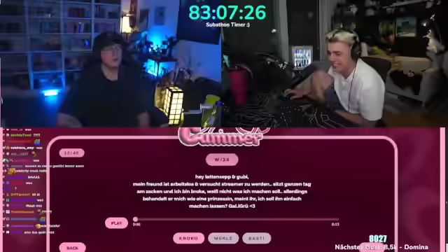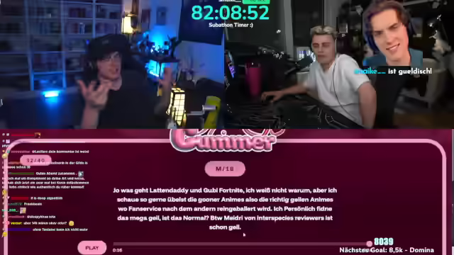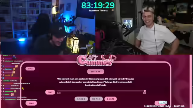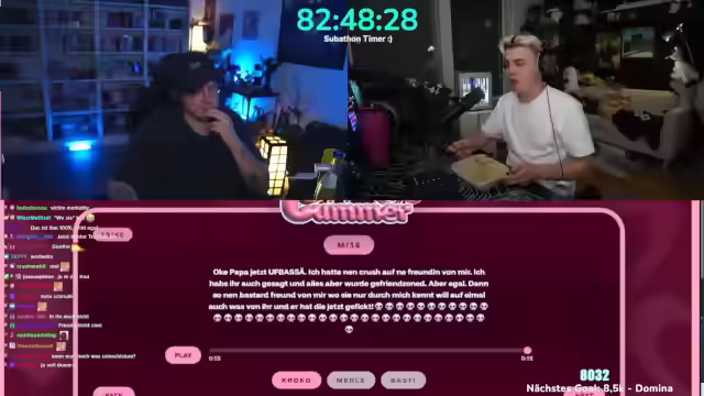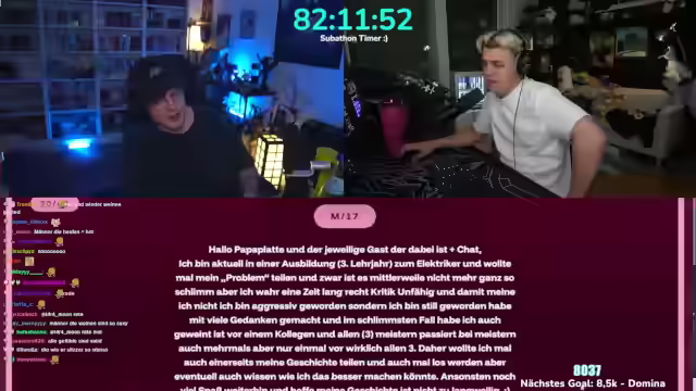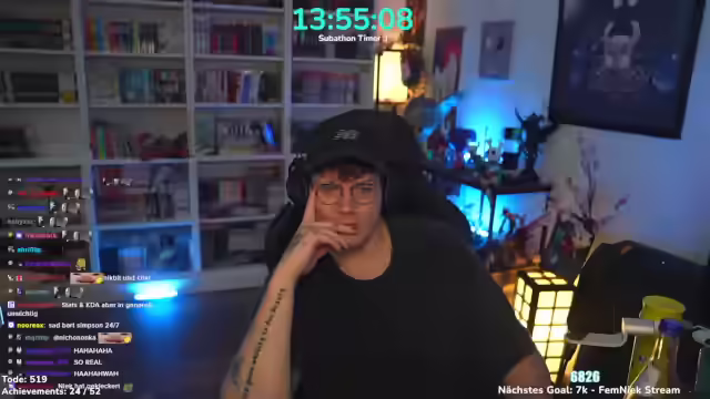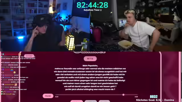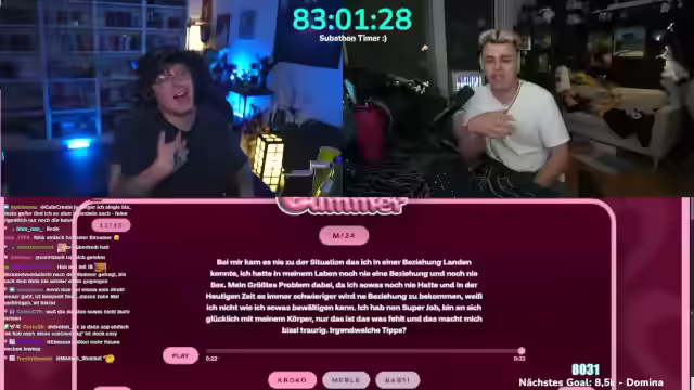 03:23:28Der Streamer freut sich über fast 8000 Subs und hält diese Zahl für verrückt. Er kündigt an, dass er um 20 Uhr mit Kevin in den Kummerkasten gehen wird und bis dahin noch eine Stunde Silksong spielen kann. Er überlegt, sich "Fubi" auf die Augenbraue zu schreiben, um seine Wertschätzung auszudrücken. Er versucht, den Namen mit einem Stift aufzumalen, scheitert aber an der spiegelverkehrten Darstellung. Er entschuldigt sich bei Fubi dafür, dass er es nicht schafft, den Namen richtig zu schreiben. Der Streamer und seine Mods sind überwältigt von der langen Timerzeit von 82 Stunden. Er bedankt sich bei seinem Team für die viele Arbeit und den YouTube-Content. Er fragt den Chat nach Ideen für ein Video über die letzten Stunden und schlägt den Titel "Ich krieg ultra viel Geld und komm nicht klar?" vor. Er spricht über mögliche Sponsoring-Deals mit EA für Skate-Spiele und plant, dies vorher abzuklären. Er kündigt an, dass er sich die Beine wachsen wird, wenn die 8000 Subs erreicht werden. Er reflektiert über seine Erfahrungen im Sabaton und dass er dadurch gewachsen ist. Er betont, dass er gestärkt aus dem Sabaton hervorgehen wird und dass er gelernt hat, jeden Tag 12 Stunden zu streamen. Er spricht über seine Erkenntnisse über Freundschaften und Beziehungen zu anderen Streamern und Freunden.