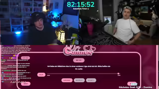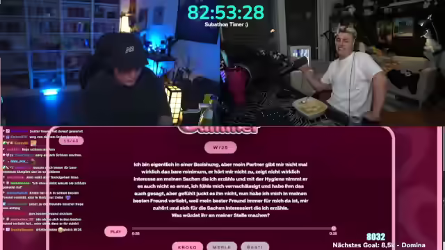 04:21:33Es wird erwähnt, dass Silksong gespielt wurde, mit dem Ziel, 100% im Spiel zu erreichen. Die Spielzeit beträgt bereits 82 Stunden. Es wird die Frage aufgeworfen, ob der Stream so lange geht, bis das Spiel beendet ist. Anschließend wird die bevorstehende Show namens 'Dr. Kammer' vorbereitet, für die Kenny und Robin eine spezielle Webseite erstellt haben. Der Name 'Dr. Kammer' wird als von Kenny stammend hervorgehoben, wobei betont wird, dass keine Verantwortung dafür übernommen wird. Es wird ein TikTok-Video von Kevin im Zusammenhang mit Samwise Wilde erwähnt, was zu Überlegungen über Gewichtsverlust führt. Abschließend werden Vorbereitungen für die Community-Fragen getroffen, die in der Show 'Dr. Kammer' behandelt werden sollen, wobei Chad Fragen aus der Community erhalten hat, die gemeinsam mit Niek gelöst werden sollen. Die Show beginnt mit einem Intro und behandelt Dating-Probleme aus der Community, wobei Niek als Experte hinzugezogen wird. Die musikalische Untermalung der Show wird diskutiert, wobei verschiedene Optionen wie Kuschelrock und Date Night Jazz in Betracht gezogen werden. Die erste Frage kommt von M14, der in ein Mädchen aus seiner Klasse verknallt ist, aber unsicher ist, ob sie Interesse an einer Beziehung hat. Es wird geraten, es nicht zu eilig anzugehen und zuerst ein Eis essen zu gehen, um die Stimmung zu testen.