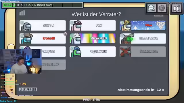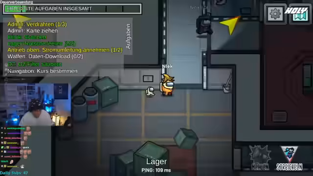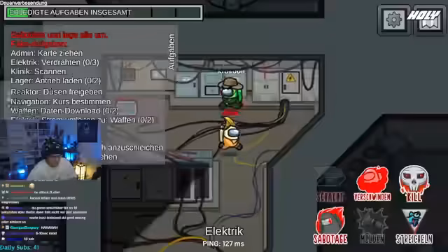 02:40:00Die Stimmung in der Lobby wird chaotisch. Ein Spieler, vermutlich der Imposter, nutzt unsichtbare Fähigkeiten, was Verwirrung stiftet. Es kommt zu mehreren Todesfällen in kurzer Zeit, die strategische Überlegungen der Crewmates überflüssig machen. Der Streamer zeigt sich frustriert über das "geisteskranke" Verhalten und die mangelnde Koordination des Teams. Nachdem ein Mitspieler ausgerufen wird, kündigt der Streamer einen letzten, humorvollen Versuch an, den Imposter zu fassen, indem er ein Ratespiel mit den Zuschauern inszeniert.