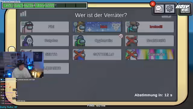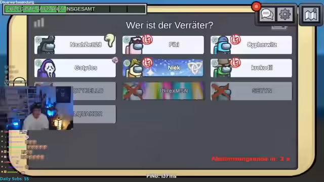 03:15:57Nach mehreren Fehlentscheidungen, die zum Ausscheiden von unschuldigen Spielern führen, beschreibt der Stream die daraus resultierende Frustration. Der Streamer versucht, die Stimmung zu stabilisieren und schlägt eine demokratische Abstimmung vor, wenn die Identität des Imposters unklar ist. Trotzdem bleibt die Enttäuschung über die Verluste und das Gefühl von Hilflosigkeit aufgrund von schlechten Plays.