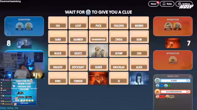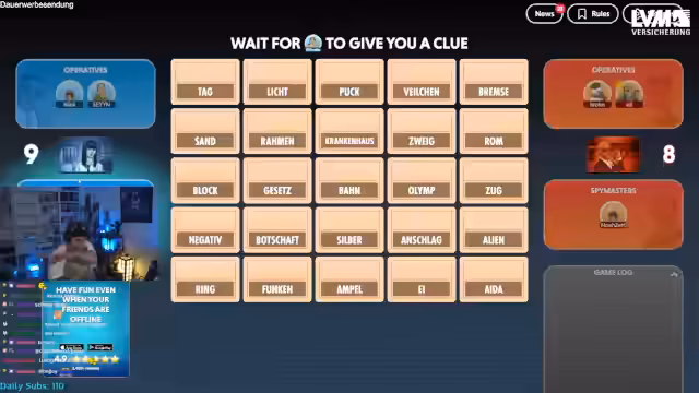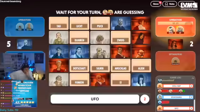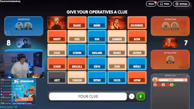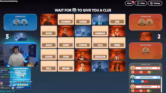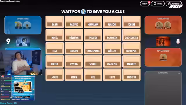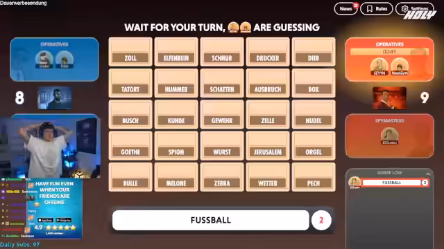 04:41:21Der Streamer übernimmt für die nächste Runde die Rolle des Spymasters für sein Team. Die Runde beginnt mit den Begriffen Zoll, Elfenbein, Schnur, Drucker, Dieb, Startort, Nummer, Schatten, Ausbruch, Bock und Pusch. Der Streamer gibt den Hinweis 'Fußball 2', worauf seine Mitspieler versuchen müssen, die zwei damit verbundenen Wörter zu identifizieren. Die Runde erfordert schnelles assoziatives Denken und eine enge Abstimmung, um die richtigen Begriffe zu treffen und falsche Markierungen zu vermeiden, die das Team sonst ins Spiel ausschließen würden.