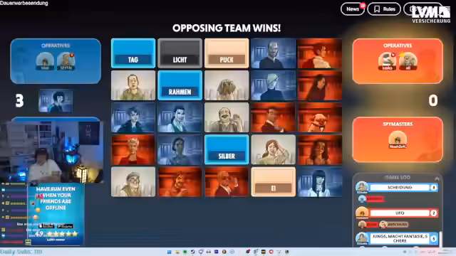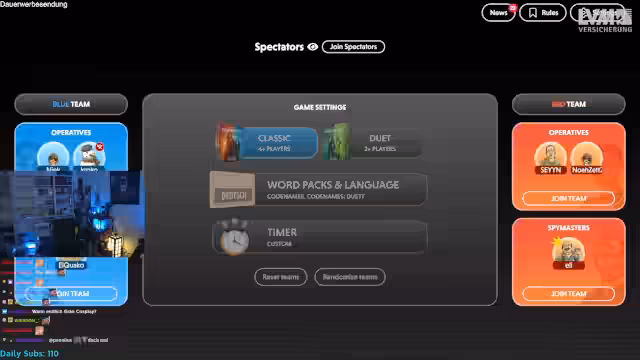 04:25:26Zu Beginn des Streams wird die Formation der Teams für die geplanten Spiele Codenames und Golf besprochen. Der Streamer äußert den Wunsch, in einem Dreier-Team mit Nickbitt und der Geburtstagsente zu spielen. Da es sich jedoch nicht um ein Wunschkonzert handelt, erfolgt die Teamzusammenstellung per Los. Es wird entschieden, dass sechs Spieler teilnehmen und Teams im 3-gegen-3-Format gebildet werden. Unmittelbar vor dem Start von Codenames wird die Teamzugehörigkeit bekannt gegeben und die Regeln kurz erläutert, bevor das Spiel beginnt.