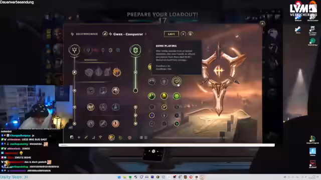 01:11:02Die Anfangsphase des Streams ist geprägt von strategischen Diskussionen über Champion-Wahlen und Runen im Spiel League of Legends. Es gibt eine Debatte über Bone Plating als Runenwahl gegen Burst-Champions und eine Anfrage an Chat, welcher Champion gewählt werden soll. Der Streamer spricht darüber, dass er den Varus auf der Toplane spielen wird und dass die Wahl des Champions eine schwierige Entscheidung darstellt. Auch werden die neue Patch-Version 26.3 und die dort enthaltenen Champion-Änderungen kurz angesprochen.