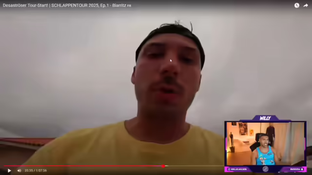 03:28:12Der Streamer kündigt die Schlappentour 2025 an, die zweimal wöchentlich (sonntags und mittwochs um 20 Uhr) auf YouTube ausgestrahlt wird. Die Tour führt durch Südfrankreich, Spanien und Portugal und dauert drei Wochen, aufgeteilt in neun Folgen. Es werden Gäste dabei sein, von denen zwei im aktuellen Video vorgestellt werden. Die Fahrt geht 13 Stunden in den Südwesten von Frankreich, direkt nach Biarritz. In Frankreich wird ein "Gap" entdeckt, was an Tag 0 im letzten Jahr erinnert. Es wird überlegt, ob ein Sprung über das Gap gewagt werden soll. Das Calisthenics-Training zahlt sich aus. Thema Verletzung ist präsenter als sonst. Im Shop sind neue T-Shirts erhältlich. Es wird versucht, einen A-Clip zu filmen, wobei der Fokus auf dem Edit und Behind-the-Scenes liegt. Ein geiler Drop wird gezeigt und es wird überlegt, ob er bei New Kids mitspielen könnte. Ein Sprung über ein Gap gelingt, ist aber näher am Baum als gedacht. Die Schlappentour 2025 ist offiziell eröffnet. Es folgt die Lauschau und der Shop wird angetestet. Die Fahrt geht weiter mit 950 Kilometern vor sich. Um 17:34 Uhr ist die Gruppe in Paris und um 1:22 Uhr wird ein Park erreicht, in dem gecampt wird. Tag 0 endet mit "Gute Nacht".